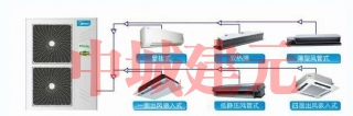2.風(fēng)管(道)式機(jī)組的基本工作過程是:供冷時(shí),室外的制冷機(jī)組吸收來自室內(nèi)機(jī)組的制冷劑蒸氣經(jīng)壓縮、冷凝后向各室內(nèi)機(jī)組輸送液體制冷劑。供熱時(shí),室外的制冷機(jī)組吸收來自冷凝器的制冷劑蒸氣經(jīng)壓縮后向各室內(nèi)機(jī)組輸送汽體制冷劑,室內(nèi)機(jī)組通過布置在天花板上的回風(fēng)口將空氣吸入,進(jìn)行熱交換后送入安裝在室內(nèi)各房間天花板中的風(fēng)管(道)內(nèi),并通過出風(fēng)口上的散流器向室內(nèi)各房間輸送空氣。在風(fēng)管(道)上設(shè)計(jì)有新風(fēng)門和排風(fēng)門,可以按一定比例置換空氣,以保證室內(nèi)空氣的質(zhì)量。